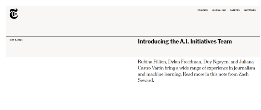 뉴욕 타임즈는 AI 와 머신러닝을 활용하여 저널리즘과 독자 경험을 개선하고자 하는 'AI Initiatives' 팀의 설립을 발표했다. 이 팀은 AI 기술을 효과적이고 책임감 있게 사용하여 보도 작업을 강화하