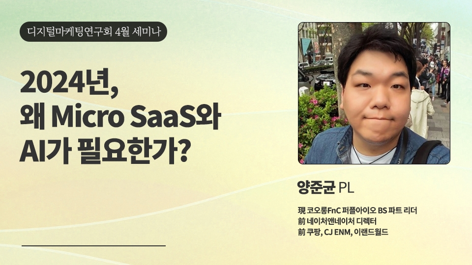 디지털마케팅 연구회(Digital Marketing Forum) 4월 세미나가 진행됩니다. 4월 주제는 “2024년, 왜 Micro SaaS와 AI가 필요한가? 버터를 나눠주는 스타트업 이야기, 퍼플아이오 -“ 라는 주제로 진행 됩니다.