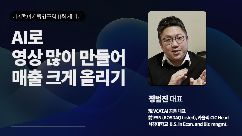 디지털마케팅 연구회(Digital Marketing Forum) 11월 세미나가 진행됩니다. 11월 주제는"AI로 광고 영상 만들어 매출 올리는 법" - 제품 URL만 넣으면 1분 만에 마케팅 영상을 만드는 VCAT.AI 사례-라는 주제