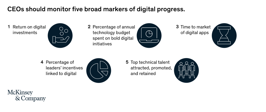 조직이 점점 더 많은 디지털 이니셔티브를 시작함에 따라 CEO는 비즈니스 결과를 도출하고 있는지 모니터링해야 하며 이러한 Matrix을 주시해야 한다. 1. Return on digital investments 디지털 투자 수익을