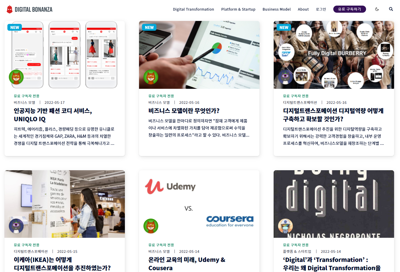디지털 트랜스포메이션,비즈니스 모델, 플랫폼&스타트업 에 관한 전략, 트렌드, 사례 등을 소개하는 디지털전략 전문서비스
