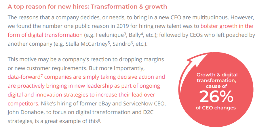 2019년에 패션기업의 CEO 70명이 새롭게 바뀌었는데 이중 26%는 기업의 디지털트랜스포메이션 전략추진을 위한 변화를 위하여 교체하였다. 무엇보다 데이터를 기반한 의사결정 및 디지털기술을 활용한 혁신을 통하여 시장을 리딩할 수 있는 리더십역량이 필요했기 때문이다