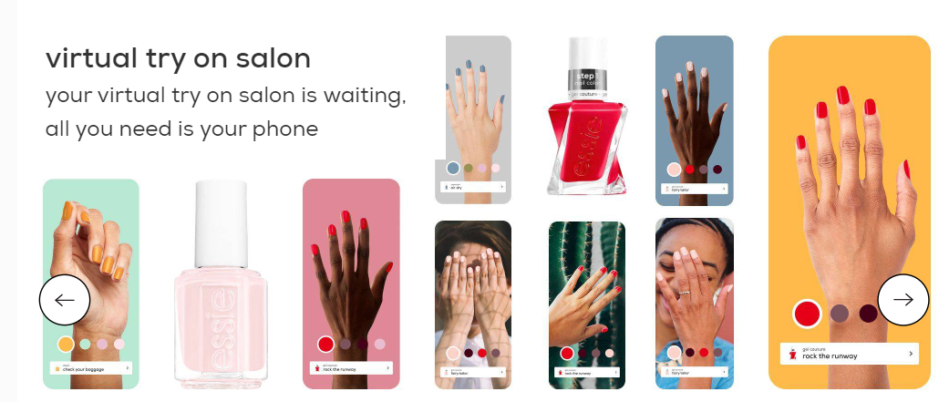 로레알( L ‘Oreal)의 네일 브랜드인 에씨(Essie) 는 모디페이스(Modiface)의 증강현실 기술을 활용해 고객이 제품을 구매하기 전에 네일의 컬러쉐이드가 손에서 어떻게 보여지는지를 확인할 수 있는