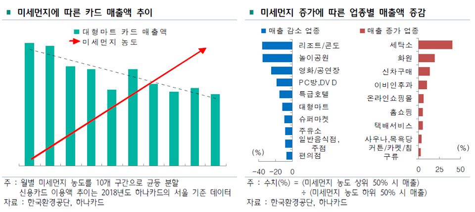 환경공단 과 하나카드 결제 데이터를 기반으로 분석한 업종별 매출액 증감 데이터 인데 온/오프라인 쇼핑의 확연하게 차이가 나고 순위로보면 세탁소 > 화원 > 신차구매 > 이비인후과 순으로 매출액이 증감한 것으로 나타난다.