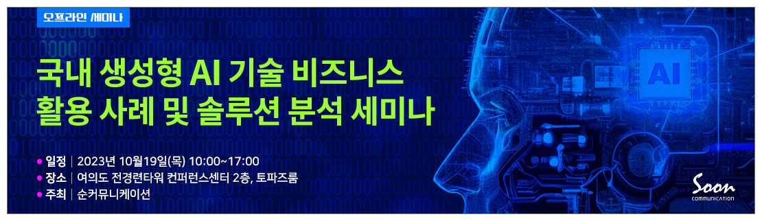 디지털이니셔티브 그룹은 10월 19일 국내 생성형 AI기술 비즈니스 활용사례 및 솔루션 분석 세미나 에서 ' 생성형 AI를 활용한 비즈니스모델 및 상품기획 방법' 이라는 주제로 발표를 진행합니다.