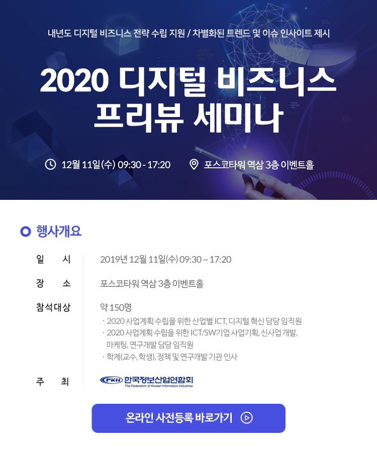 한국정보산업연합회에서 2019년 12월 11일에 진행하는 ‘2020 디지털비즈니스 프리뷰 세미나’ 에서 디지털이니셔티브 그룹이 ‘ 2020 디지털마케팅트렌드 와 전망’ 이라는 주제로 발표를 진행합니다. 관심있는 분들의 많은 참여 바랍니다.