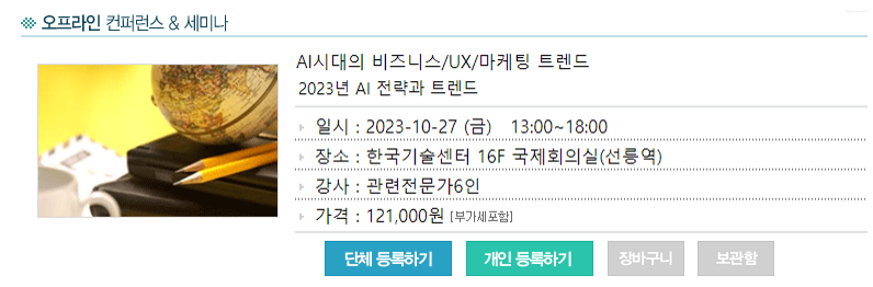 일시 : 2023년 10월 27일(금) 13:00 ~ 18:00 장소 : 선릉역 한국기술센터 16F 국제회의실 강사 : 관련전문가 6인 교육비 : 사전등록 - 121,000원 (모든 교육비에 부가세 포함 | 교재 포함 | 중식 불포함) 현장