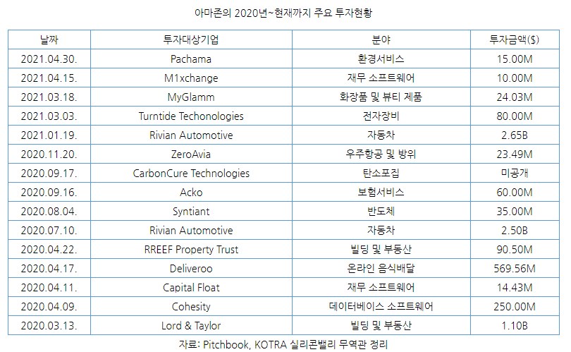 아마존의 투자 포트폴리오를 보면 미국 다음으로 제2의 아마존을 구축하기 위한 거점으로 인도시장을 확보하기 위한 Vertical Platform 투자를 강화하고 있으며, 다음으로 전기자동차를 개발하는 Rivian에 단일규모로 가장 많은 투자를 하고 있으며, 저탄소기반 제조업체에도 집중 투자하고 있다.