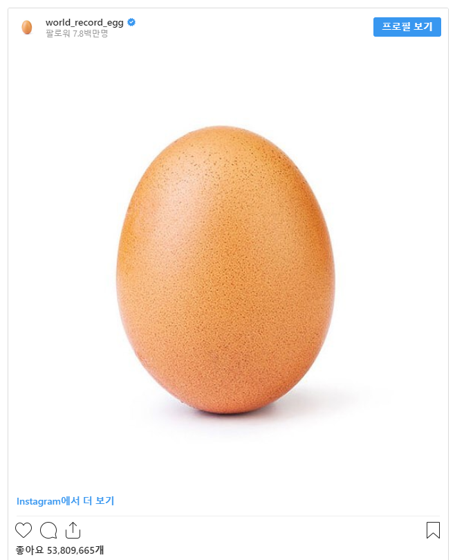 인스타그램에서 가장 좋아요를 많이 받은 1위는 'World Record Egg' 로 5380만의 좋아요를 기록하였다.