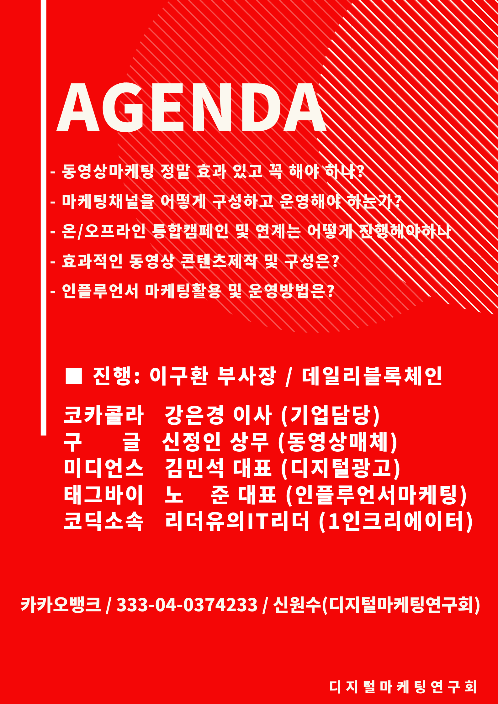 디지털마케팅에 관심을 가지고 있는 업계실무자 및 학계/연구자들이 함께 매월 함께 모여 디지털마케팅에 관한 최신트렌드를 분석하고 토론, 연구하는 '디지털마케팅 연구회'에서 각 분야의 전문가분들을 모시고 "유튜브로 갈아타기만 하면 기업 디지털커뮤니케이션 문제가 없는가? - 동영상 시대의 기업 디지털커뮤니케이션 대응 전략 –" 라는 주제로 '디지털마케팅 오픈포럼'을 개최합니다. 관심있는 분들의 많은 참여 바랍니다.