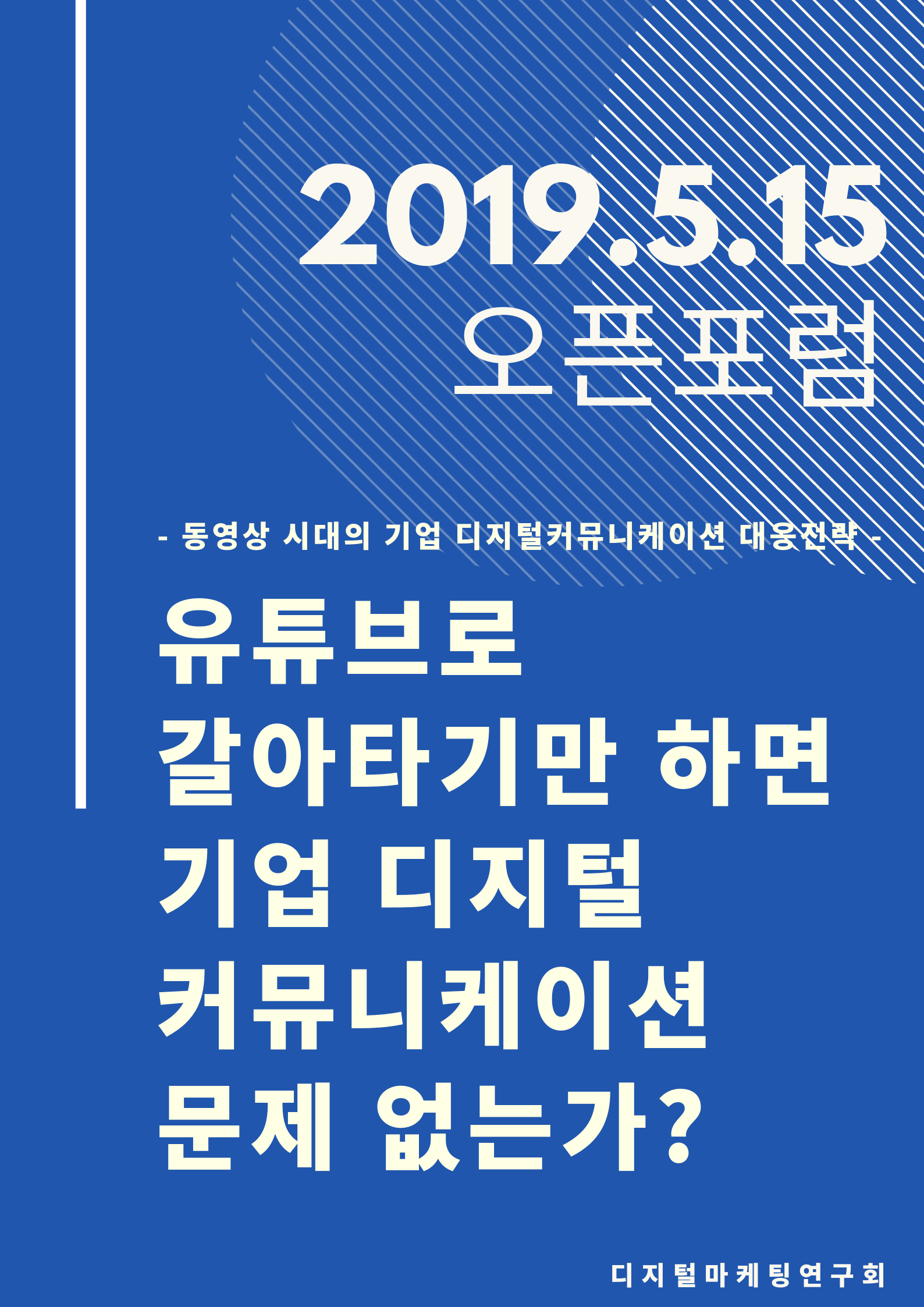 디지털마케팅에 관심을 가지고 있는 업계실무자 및 학계/연구자들이 함께 매월 함께 모여 디지털마케팅에 관한 최신트렌드를 분석하고 토론, 연구하는 '디지털마케팅 연구회'에서 각 분야의 전문가분들을 모시고 "유튜브로 갈아타기만 하면 기업 디지털커뮤니케이션 문제가 없는가? - 동영상 시대의 기업 디지털커뮤니케이션 대응 전략 –" 라는 주제로 '디지털마케팅 오픈포럼'을 개최합니다. 관심있는 분들의 많은 참여 바랍니다.