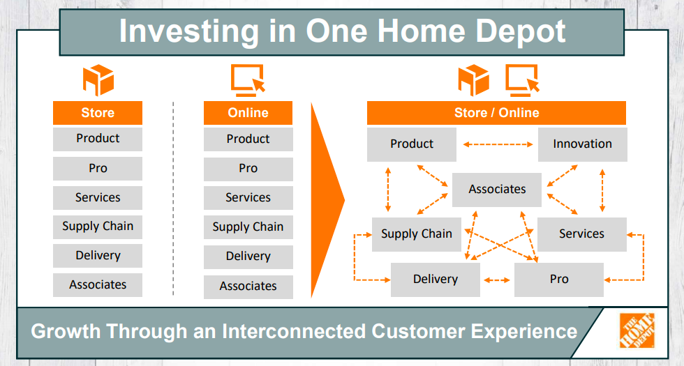 홈데포는 온라인과 오프라인 채널을 통합하는 옴니채널(Omni-Channel) 전략으로 ‘One Home Depot’ 전략을 추진하고 있다. 홈데포 CEO인 Craig Menear는 “우리 매장의 정문은 존재하지 않습니다. 존재한다