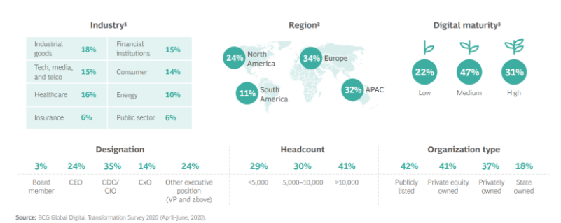 보스턴 컨설팅 그룹은 코로나-19 영향으로 기업의 디지털트랜스포메이션 전략이 어떻게 변화 되었는지를 분석하기 위하여 2020년 3개월간(3월~6월) 825명의 글로벌 리더들을 대상으로 설문조사를