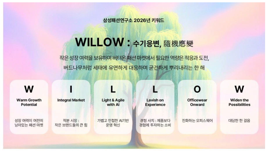 2026년 대한민국 패션 시장은 저성장의 고착화라는 거대한 파고 속에서 '유연한 생존 전략'을 시험받게 될 전망이다. 삼성패션연구소는 2026년 패션 시장을 관통하는 핵심 키워드로 ‘WILLOW(버드나무·수기응변)’를 선정했다. 이는 강풍에 흔들릴지언정 부러지지 않는 버드나무처럼, 예측 불가능한 시장 환경에 민첩하게 대응하는 태도가 기업의 생존을 결정짓는 핵심 역량이 될 것임을 시사한다.