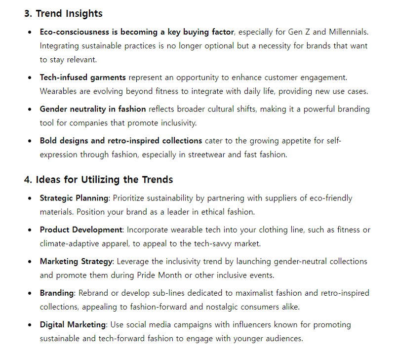 사용자가 입력한 쿼리에 대해 최신 트렌드에 기반한 전략적 조언과 아이디어를 제공하고 구체적인 실행 방안을 지원합니다. 최신 데이터와 분석 방법을 활용하여 사용자가 시장의 변화를 이해하고 경쟁 우위를 확보할 수 있도록 지원합니다.