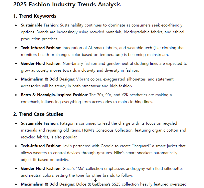 - Google 검색 API를 GPTs의 'Action'으로 호출해 구글검색을 기반하여 검증되고 신뢰할 수 있는 출처에서 최신 2025년 트렌드를 분석하도록 하였습니다.