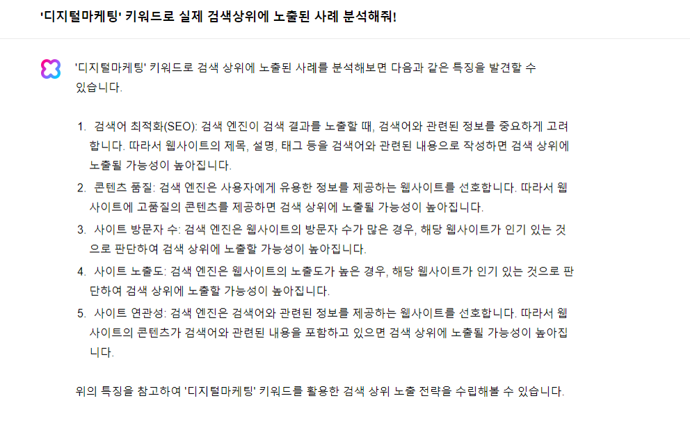 앞서 질의한 검색엔진 상위 노출 과 동일한 답변이 출력되었습니다. '디지털마케팅' 키워드를 삽입했기 때문에 동일한 내용이라도 앞에서 '디지털마케팅' 이라는 키워드를 붙여서 출력 되는게 정상인데... 그렇지 않고 동일한 내용이 출력이 되었습니다.
