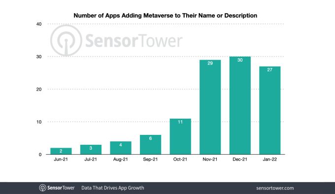 Sensor Tower 조사에 따르면 Apple 앱스토어 및 Google Play의 제목 과 설명문에 메타버스 단어를 포함한 모바일앱은 현재 552개이며, 2021년 11월 부터 꾸준히 증가하고 있는 것으로 나타났다.