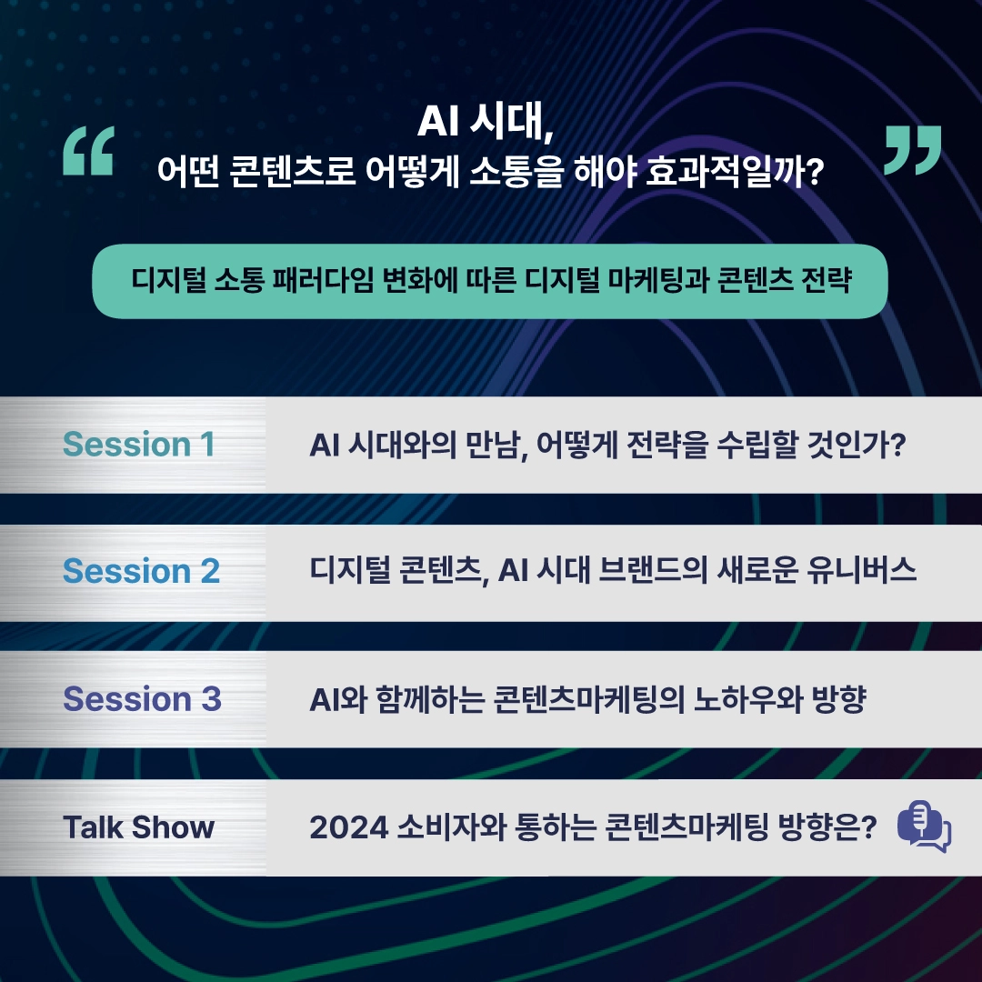 이에 대한 해답을 찾고자 오는 4월 24일(수) “2024년을 빛낼 AI시대의 마케팅 전략”을 주제로 THE CONTENTS SUMMIT 2024를 개최합니다. 본 서밋은 AI 기술이 가져온 디지털 소통 패러다임 변화를 이해하고, 이를 효과적으로 활용하기 위한 디지털 마케팅과 콘텐츠 전략을 모색하는 데 주안점을 두고 마련하게 되었습니다.