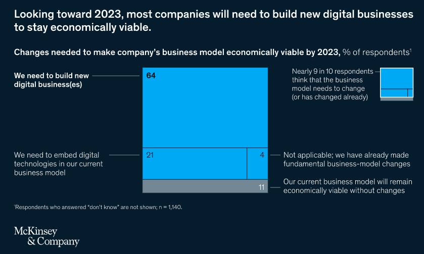 11%만이 현재의 비즈니스모델로 2023년까지 수익을창출할 수 있을 거라고 응답하였으며, 64%는 근본적으로 비즈니스모델을 재정의하고 새로운 디지털비즈니스를 구축해야 한다고 답변하였다.