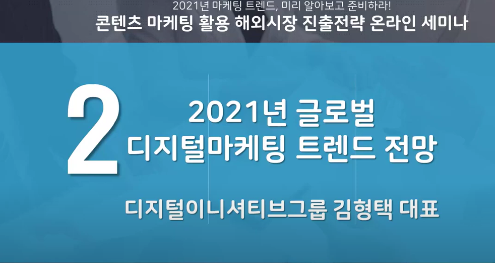 디지털마케팅 2021 글로벌 디지털 마케팅 트렌드(콘텐츠마케팅 중심으로) Marketcast 2021. 2. 2. 12:15 디지털이니셔티브 그룹이한국무역협회가 진행하는 콘텐츠마케팅 활용 해외시장 진출전략 온라인 세미나에서 ‘2021년 글로벌 디지털마케팅 트렌드’ 라는 주제로 발표를 진행한 내용입니다. 저작자표시 비영리 변경금지 (새창열림)