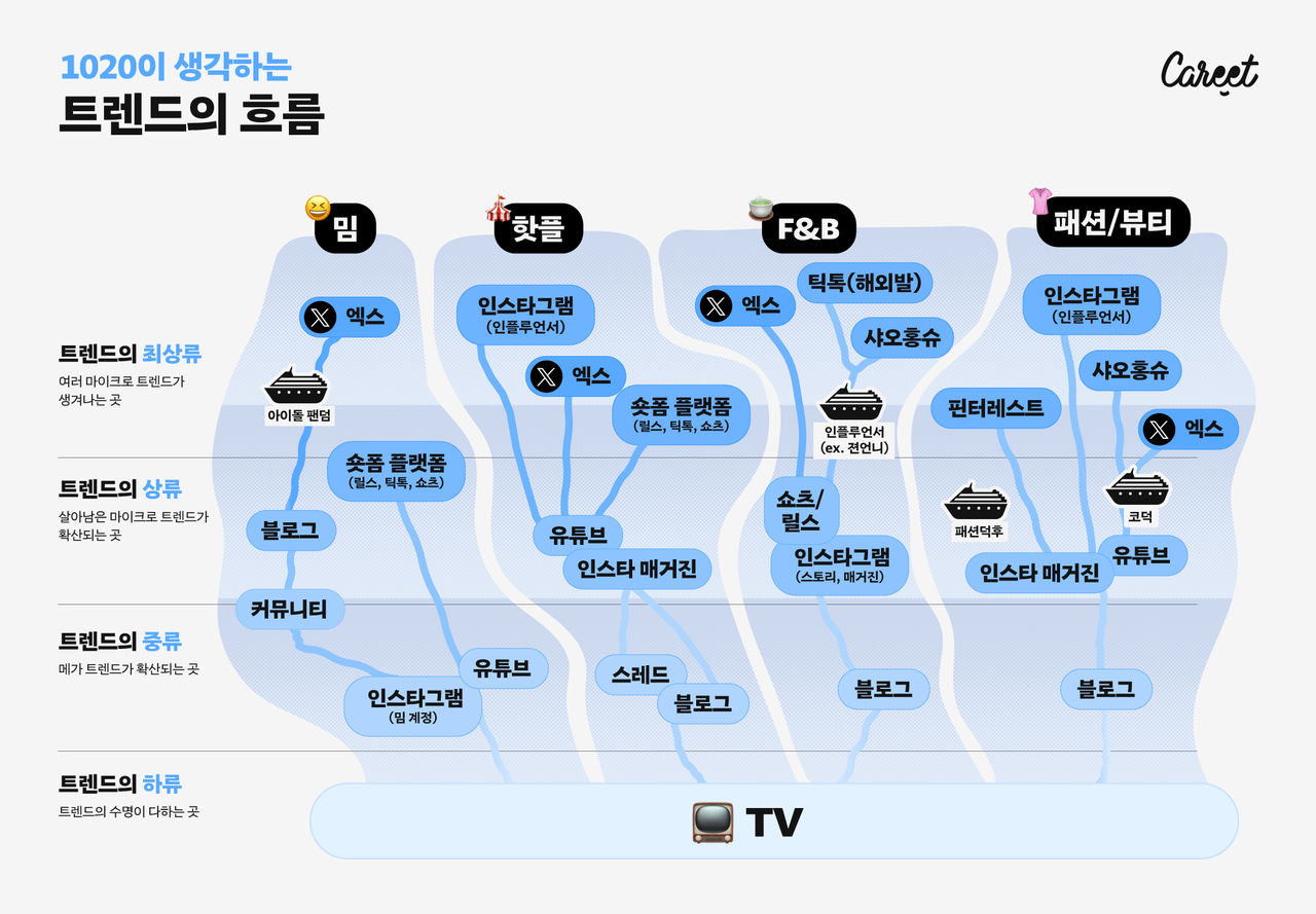 | 상류 | 살아남은 트렌드가 확산되는 구간 | 숏폼 플랫폼(틱톡, 릴스), 블로그 | 유행의 초기 확산 |